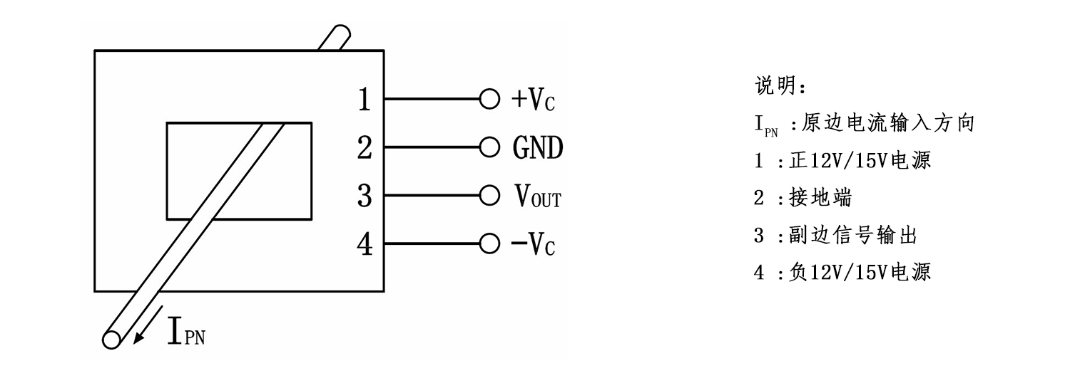 该传感器采用直测式霍尔检测原理工作。原边电流产生的磁通量聚集在磁电路中,并由霍尔器件检测出霍尔电压信号,经过放大器放大,该电压信号精准的反应原边电流。